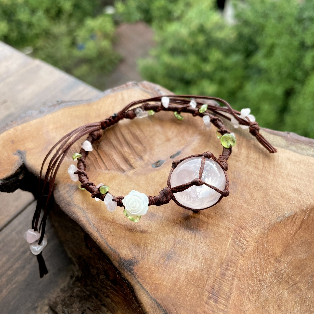 دستبند سنگ رزکوارتز، زبرجد و صدف