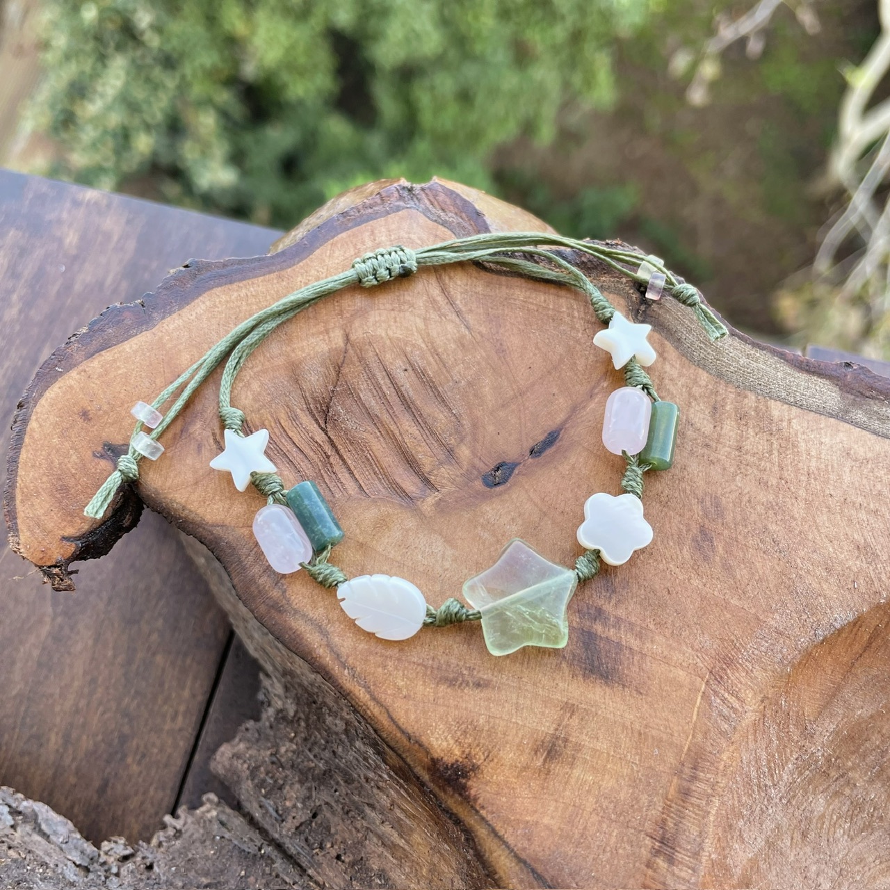 دستبند ستاره سنگ فلوریت، رزکوارتز، عقیق خزه‌ای و صدف